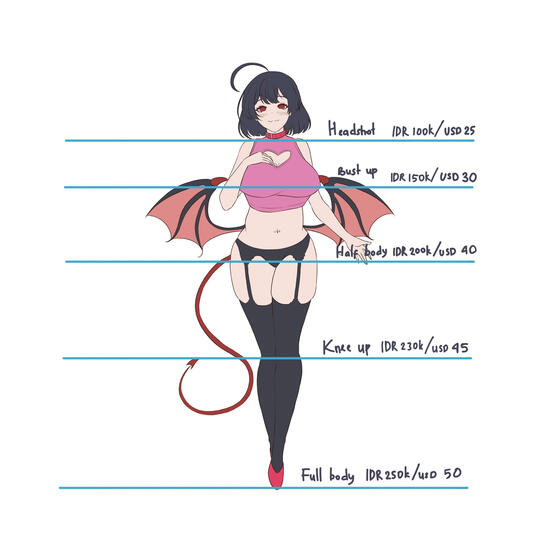 complicated/detailed character design will charge additional fee depends on difficulty. I will tell you how much it cost after you send the ref (USD 2-USD 25)cost multiply price per character(ex: 2 characters a bust up = 2 × USD 30= USD 60)normal commercial use cost multiplied by 3 (ex: bust up = USD 30 × 3 = USD 90)Detailed background will cost USD 25